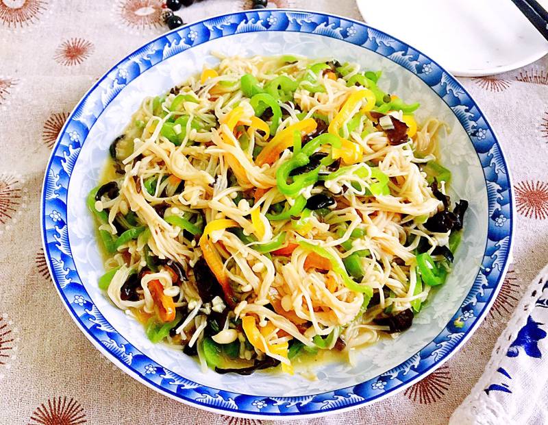 13:金针爽滑脆嫩,尖椒鲜辣增香,还有营养丰富的黑木耳,简简单单的一道素食,美味又有营养。