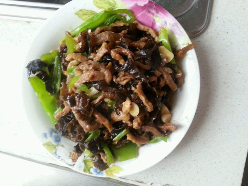 6:在放木耳丝爆炒,放点老抽,最后放蒜苗,鸡精,起锅装盘