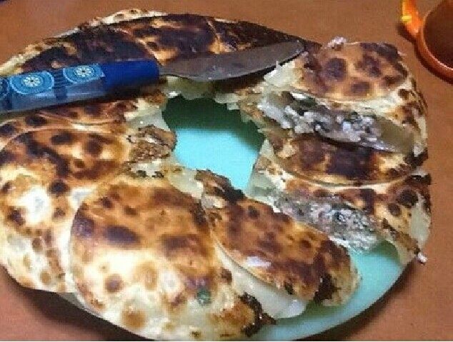 饺子皮煎一下再放肉馅,这样可以放置肉馅均匀,不用担心饺子越来越大。吃的时候用刀切一下就好