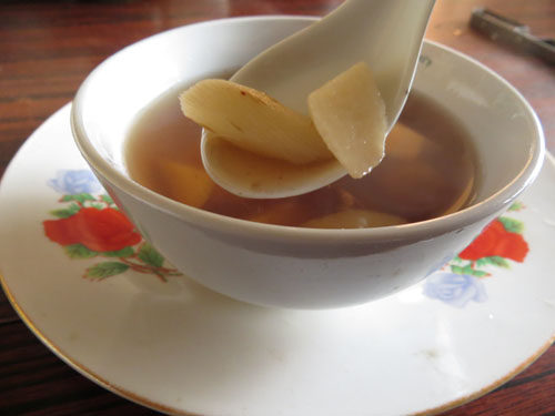 3:煮开加入洗净的灵芝和姜片。转中小火煲半小时。