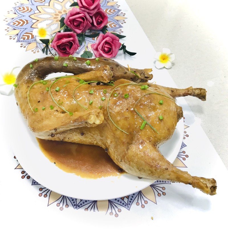 4:用文火卤,时不时翻动转动下,这样整个鸭子都入味!差不多时间了,用牙签扎下鸭腿,没血水出来就好了!