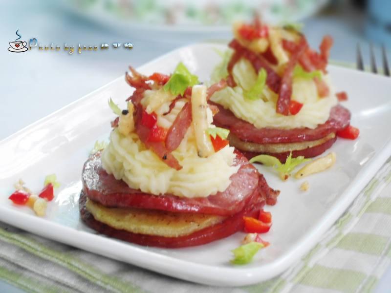 11:肉片土豆片肉片叠好,拌好的土豆泥用裱花袋在叠好的肉片上裱出自己喜欢的形状;