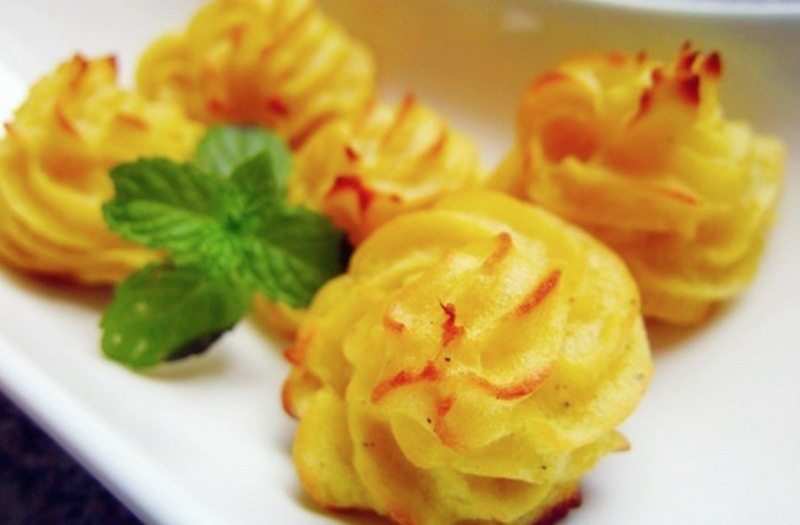 2:鸡蛋只取蛋黄加入土豆泥,再加入黄油,适量盐和黑胡椒,搅匀调味,放入裱花袋挤出小圆塔的形状
