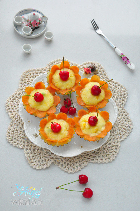 7:取一个蛋挞模具,每个里面放上40g土豆泥,压成碗状,上面挤上少许番茄酱。