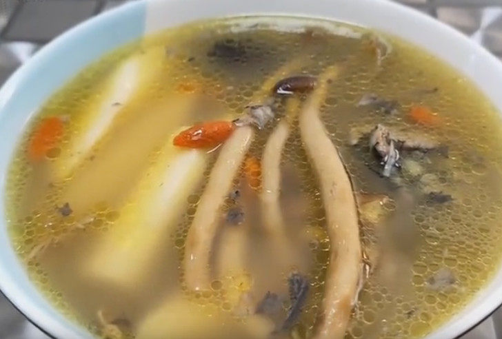 7:最后加入泡发枸杞和竹荪再炖煮5分钟即可。加入适量盐调味。