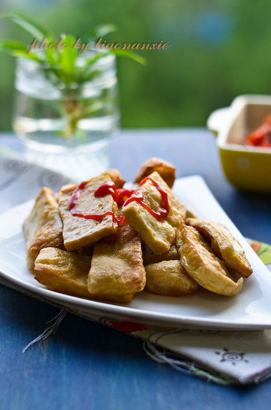 5:锅中热油,下入沾好鸡蛋液的豆腐块2面煎至虎皮色。