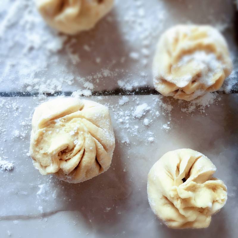 8:将发好的面团取出,擀成面皮,加入红枣馅(因为不会包很多花样,这里只能包成小笼包的模样了,)包好之后就直接放入锅中开始蒸
