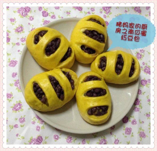 南瓜500克;面粉600克;白糖150克;自制蜜红豆适量;