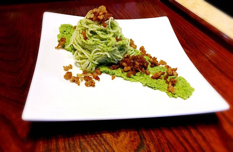 8:炒锅烧热放入一点橄榄油,倒入西兰花泥炒热关火,放入意大利面拌匀。