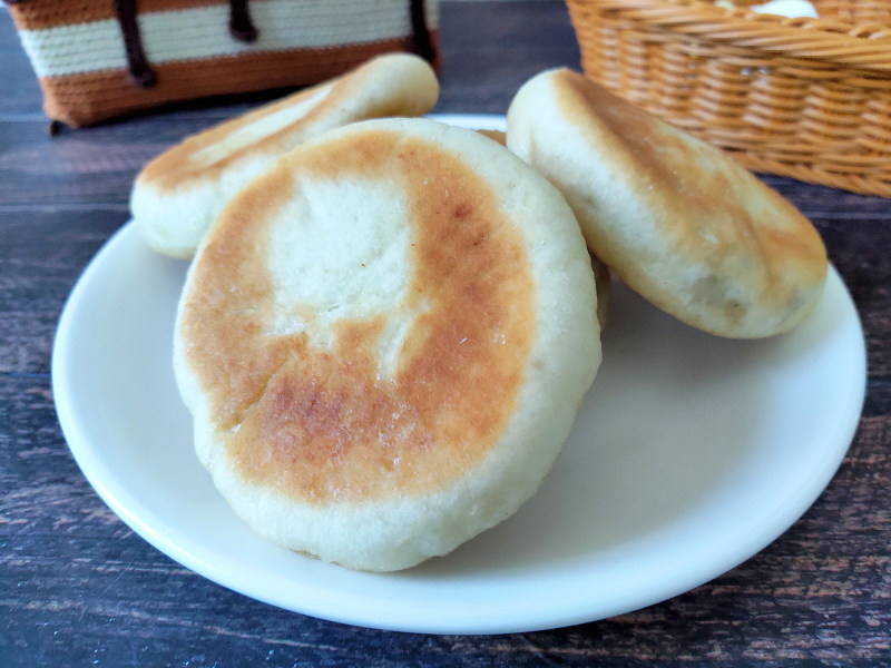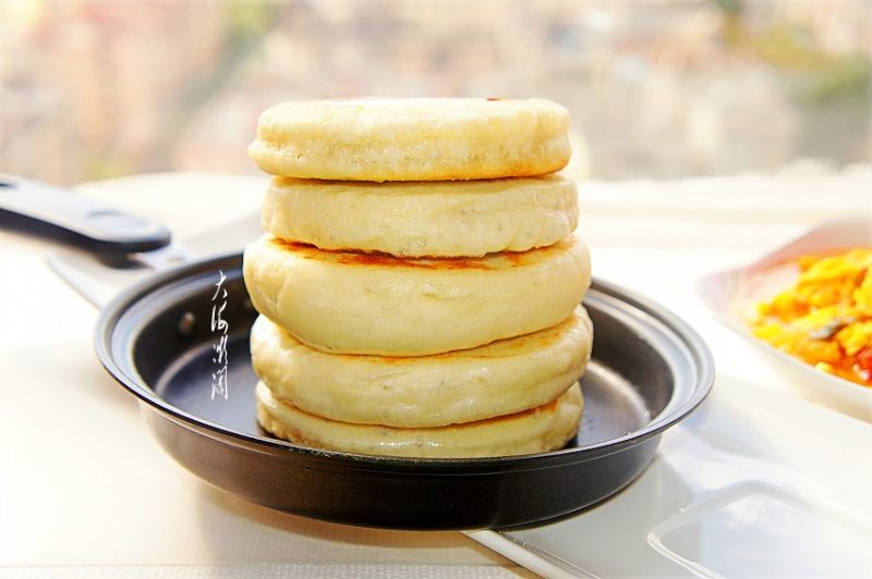 6:醒好的面揉长条切断,擀皮,包成包子后压扁,平地锅放少许油下饼煎至两面金黄即可