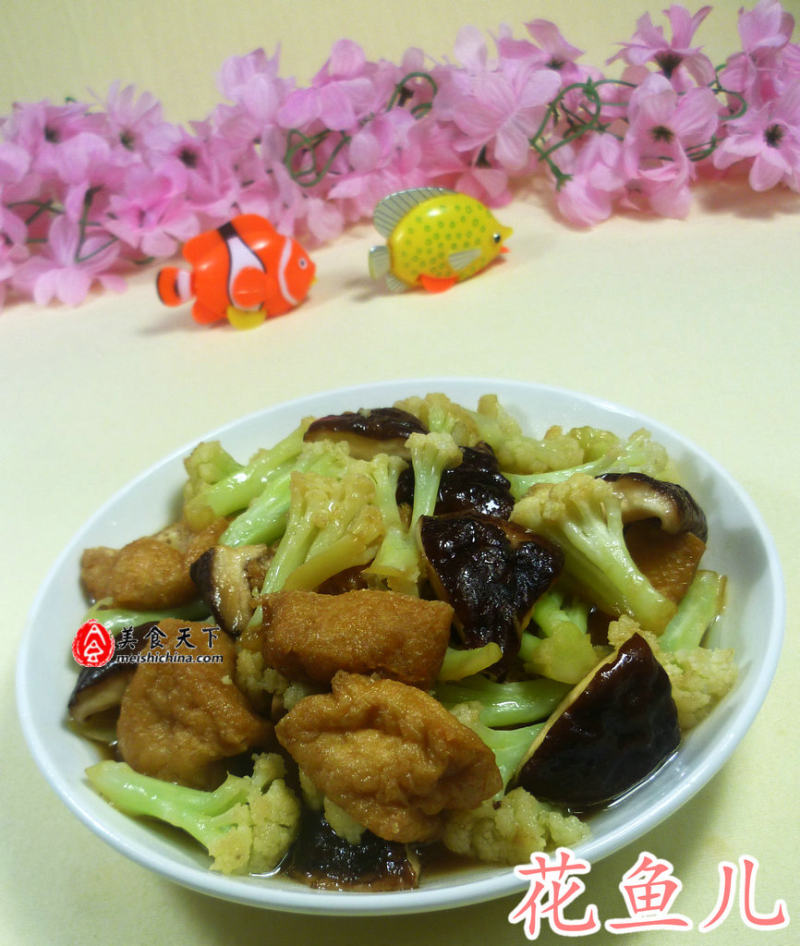 10:汤汁勾芡淋在花菜香菇上面即可。