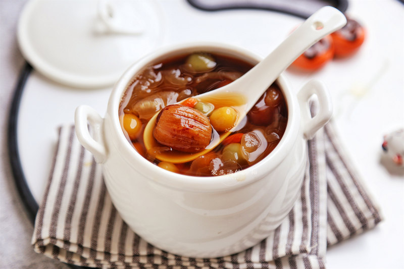 7:把红糖放入锅里,小火慢慢熬20分钟,银耳就已经软烂出胶了,我在秋冬季节会喜欢放红糖,黑糖,这对女性很有好处,春夏季节就放冰糖,更加的清爽美味。