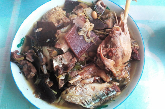 海带适量;白菜适量;排骨500g;鸡500g;老抽适量;大料适量;姜适量;