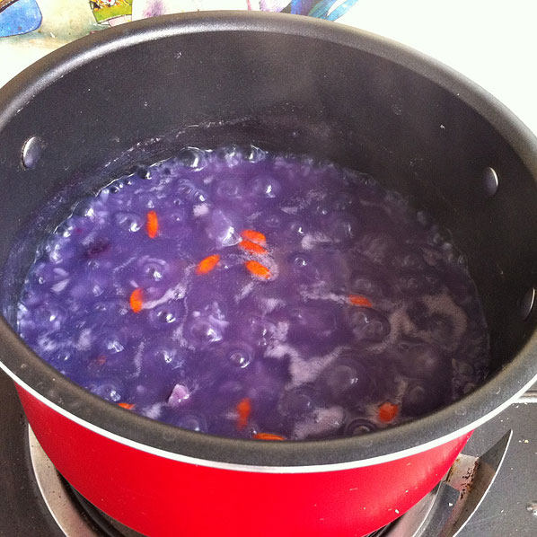 3:加入去皮切小丁的紫薯继续煮(这个时候,如果你觉得粥太稠了,可以适量添加开水)