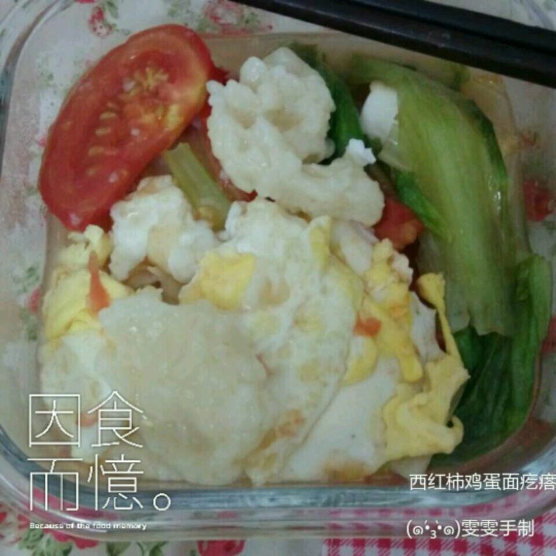 面粉100克;番茄1个;鸡蛋1个;豆芽20克;豆腐20克;青菜5棵;