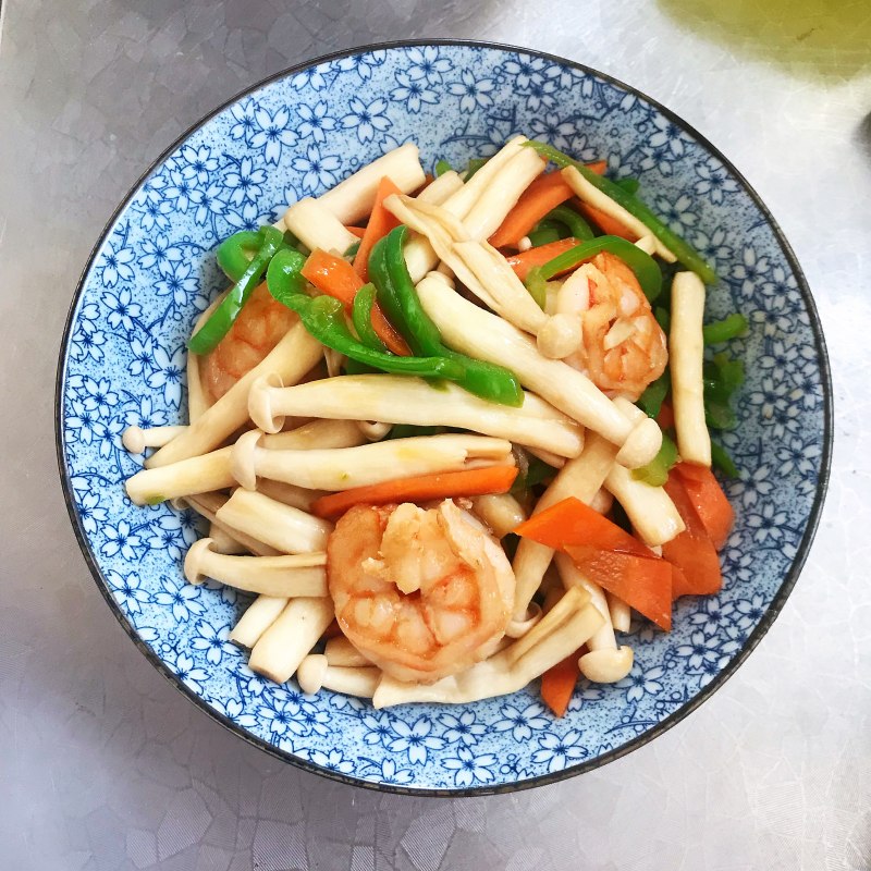 海鲜菇1袋;虾适量;青椒1个;胡萝卜1段;