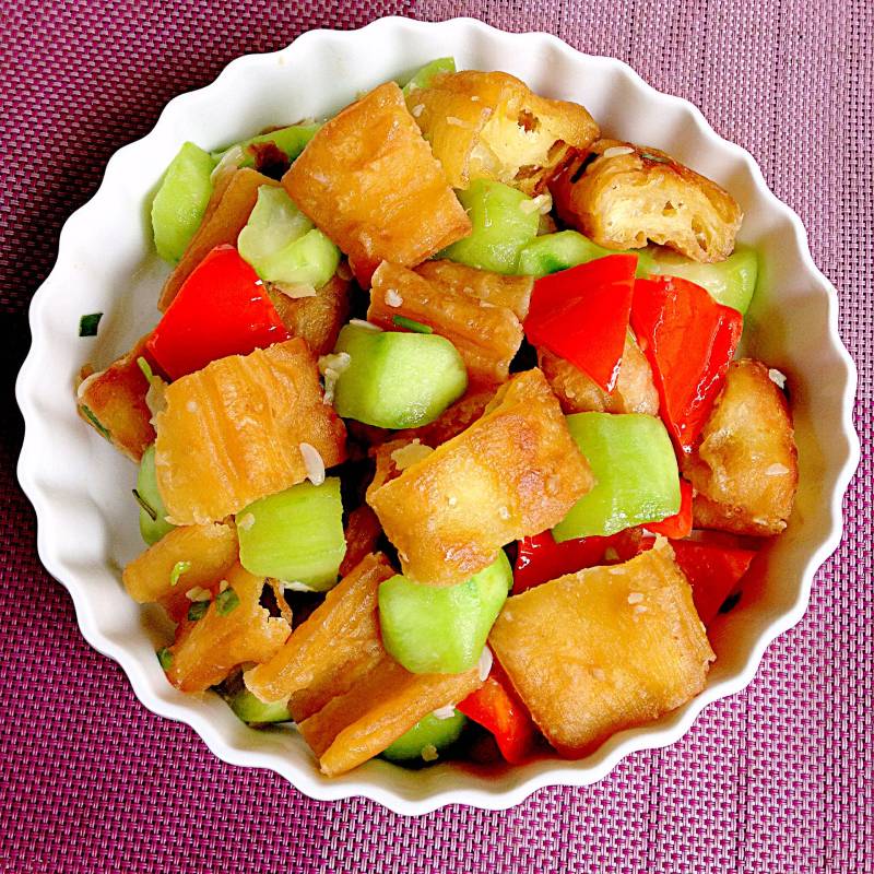 2:将丝瓜、大椒、葱蒜去皮洗净切好,油条切块。