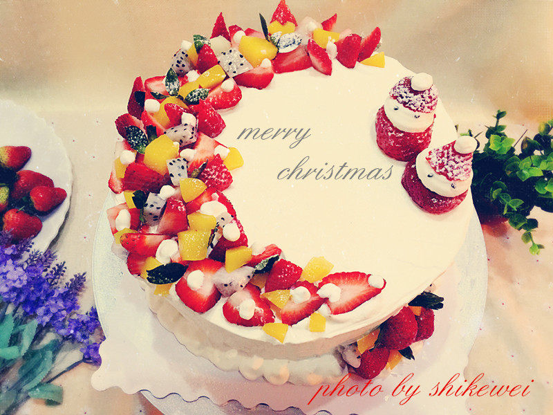 12:接下来就可以进行蛋糕面的装饰,摆上各种水果,自由发挥吧.....大家圣诞节快乐...