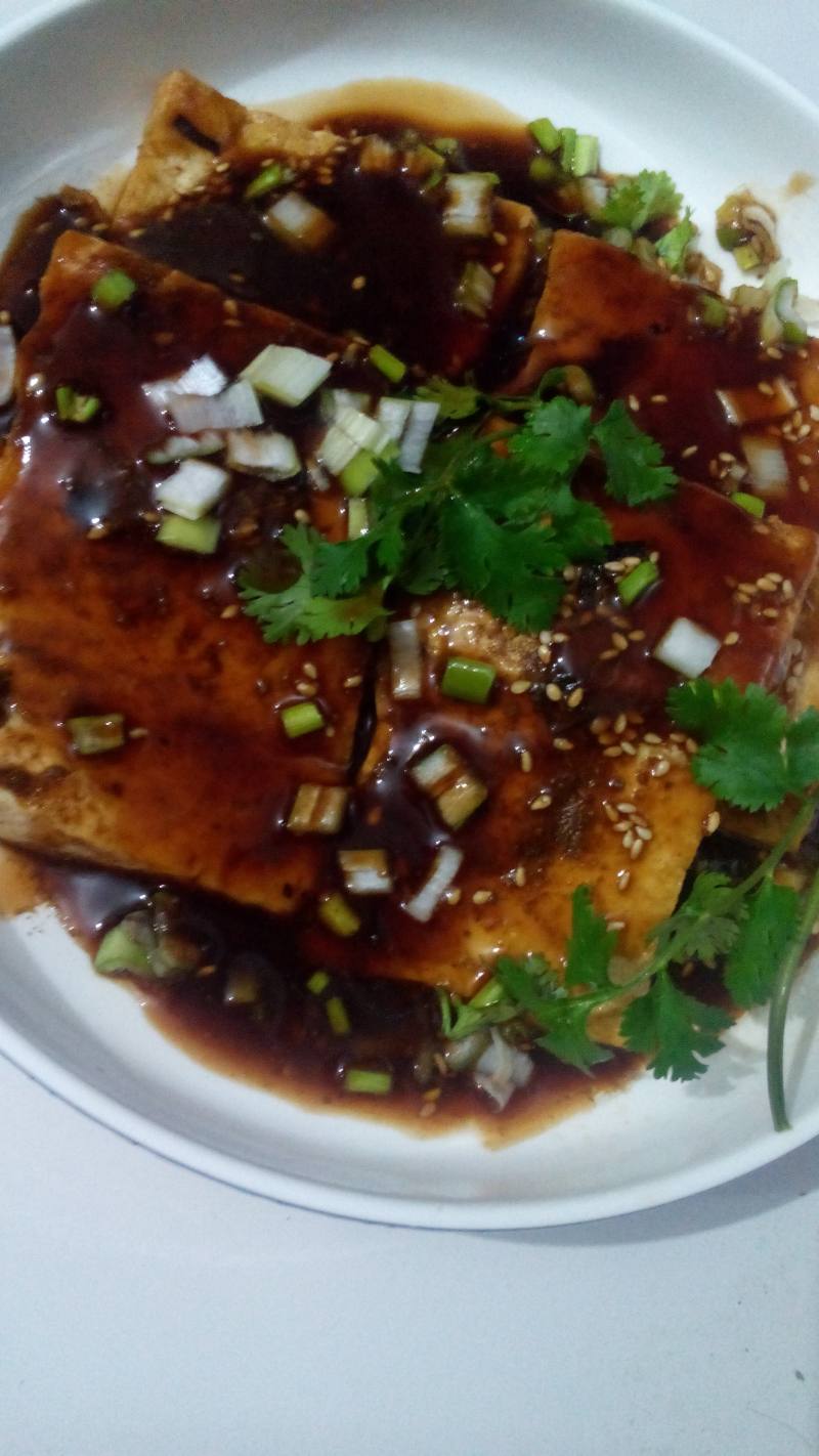 6:豆腐浇汁,并撒上葱花和香菜。