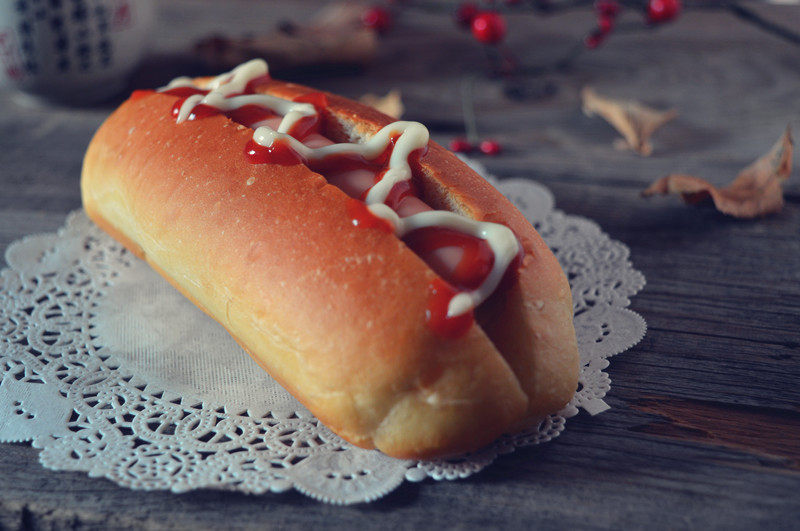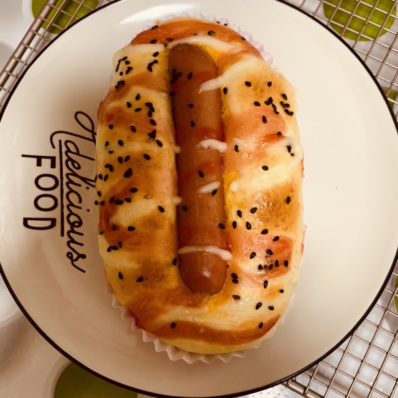 10:放上一根烤过或煎过的火腿肠,表面挤上沙拉酱,热狗面包就做好了。