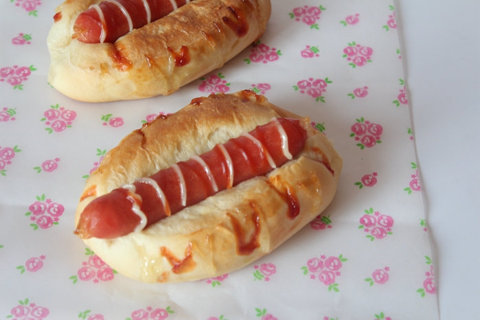火腿肠要烤过或煎过后口感更好。挤番茄酱和沙拉酱时只要把酱料装进保鲜膜,在保鲜膜的一角剪出一个小口,即可挤出。