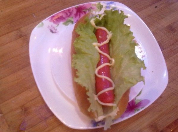 热狗香肠一个;生菜一片;丘比沙拉酱适量;