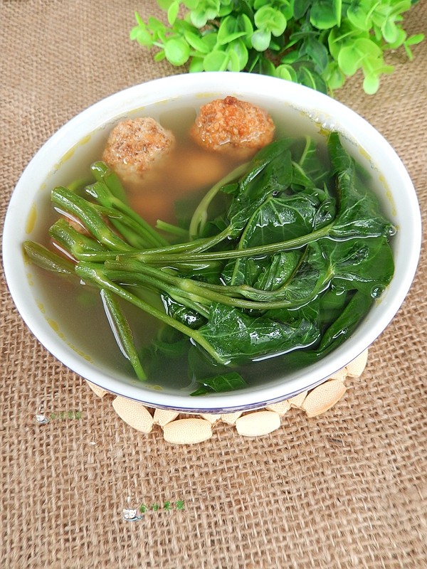 空心菜煮的时候不宜过长,把肉圆煮好再加入。