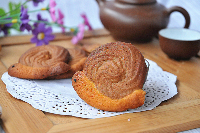 8:将可可粉在烤盘上挤出圆形螺旋形花纹,做出蜗牛的壳,原味面糊在可可面团下面挤出半圈细条,需哦从蜗牛的身体。用黑芝麻做出眼睛,放入预热好的烤箱,170度烤15分钟,熄火后余温再烘10分钟即可