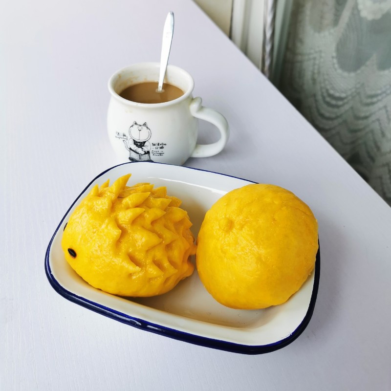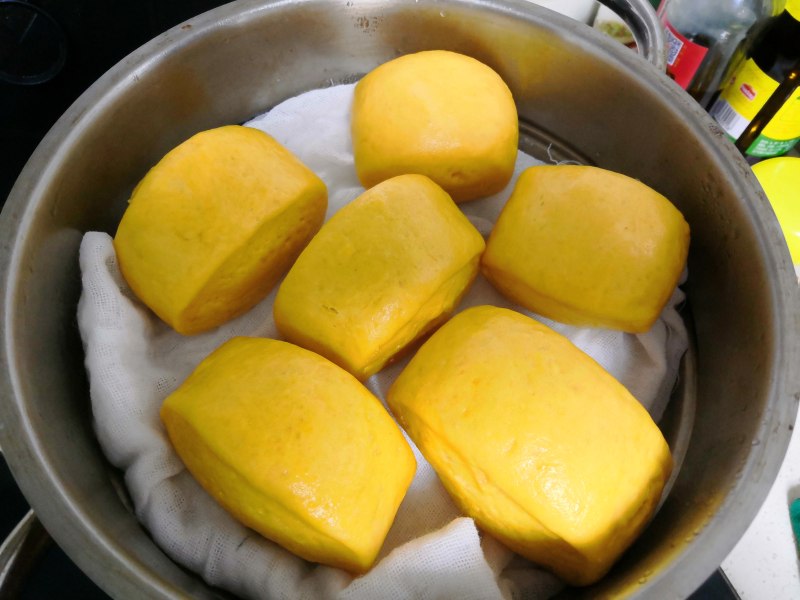 6:蒸25分钟即可,热气腾腾、金灿灿的南瓜馒头出锅了。PS:放馒头到蒸锅的时候,要多留一点空间,馒头发酵变很大、