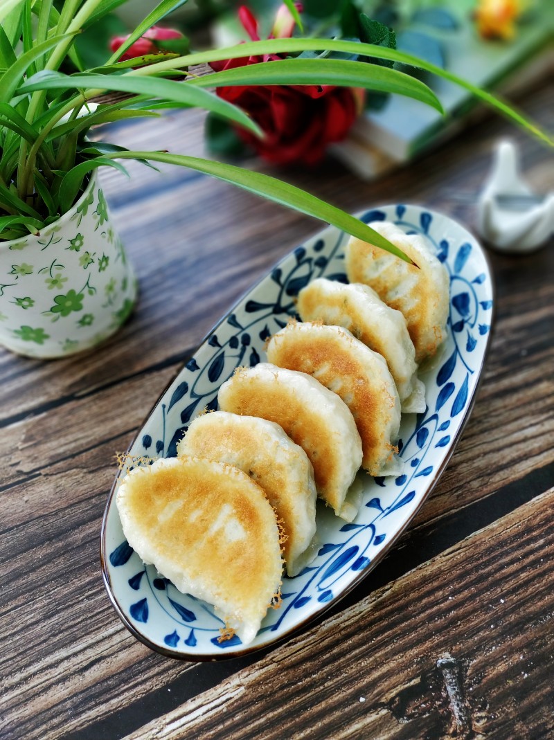 7:待底部金黄,将一边盖到另一边,做成饺形。翻边再煎一会儿,即可!