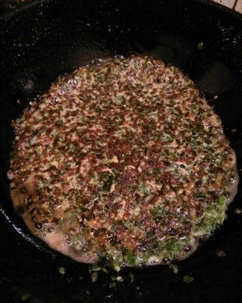 6:锅中放油烧热,倒入蛋液,煎成大饼