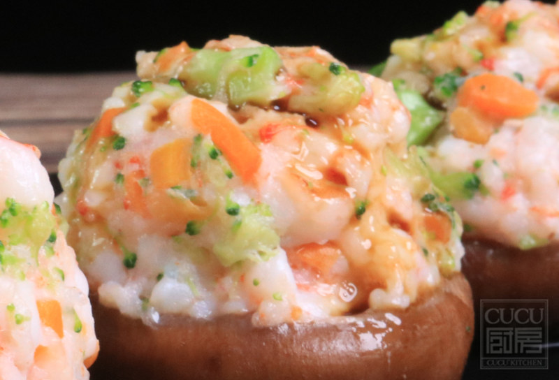 5:起锅烧水,水开后放入填好馅的香菇,蒸5分钟后取出。摆盘后撒些CUCU老陈醋,香菇爽滑、虾肉弹牙、醋汁酸爽,鲜美极了。