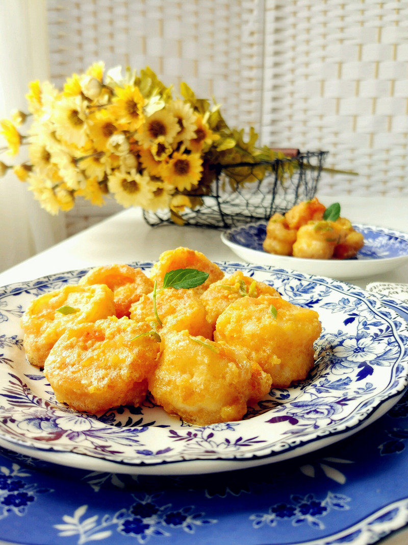 7:热锅热油,爆香葱花,将咸蛋黄倒入稍炒一下