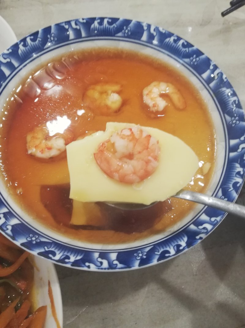 4:鸡蛋蒸了五分钟后已经凝固,放入剥好的虾继续蒸十分钟。我用的蒸箱。所以你们在在锅里蒸的按照平时蒸蛋时间就成。