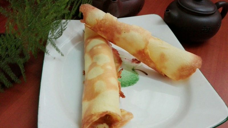 4:到一点面糊在平底锅里,小火闷熟,快摊平。到边边有点焦赶紧卷起来。
