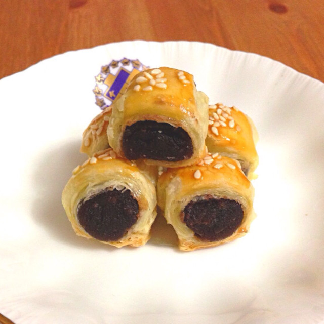 1:千层酥皮切成宽约7cm的段中间挤上一条红豆沙