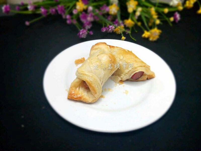 20:将烤肠放到酥皮的一角,向另一边卷去。