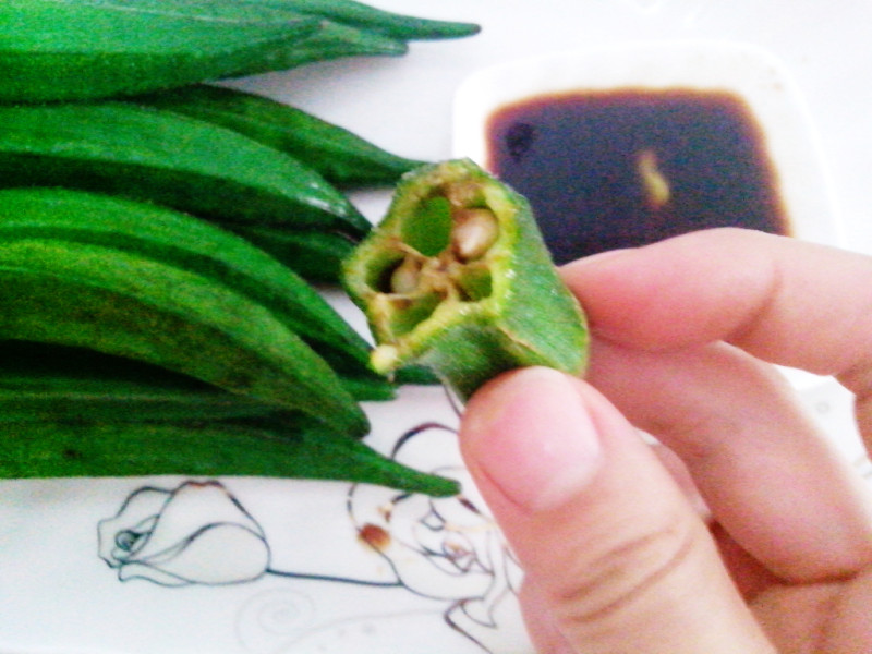 再介绍一个简单的吃法,将黄秋葵对半切开,倒入沸水中煮熟,蘸着酱醋吃,亦是美味哦!