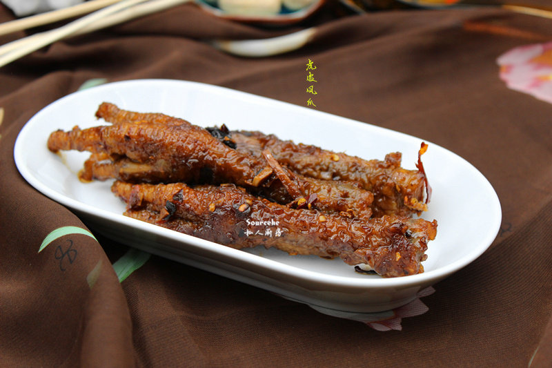9:5克糖,五香粉3克和红烧酱油10克,叉烧酱5克混合均匀后加入10克清水,料酒10克倒入凤爪内拌匀