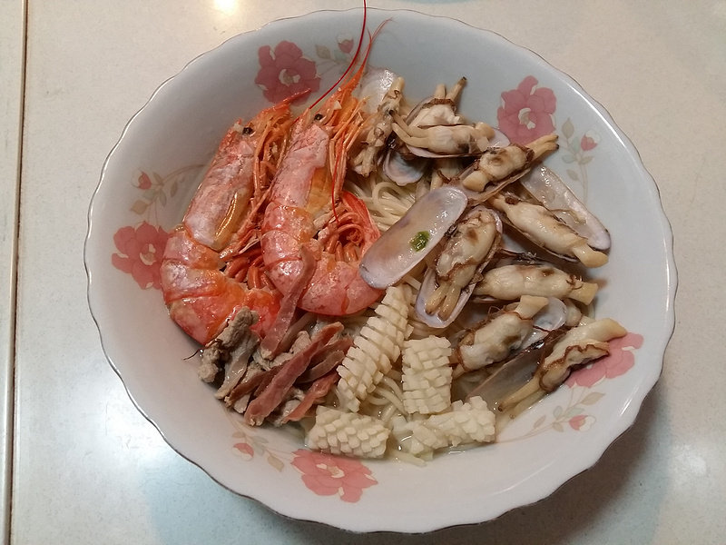 6:面捞出,浇上海鲜汤料。好吃得不留一点汤!