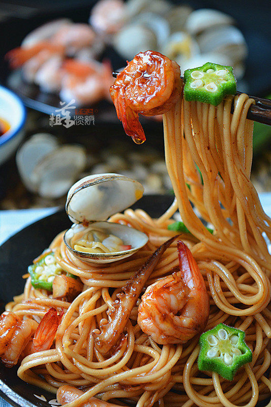 面条300g;XO酱40g;虾50g;蛤蜊60g;鱿鱼须50g;