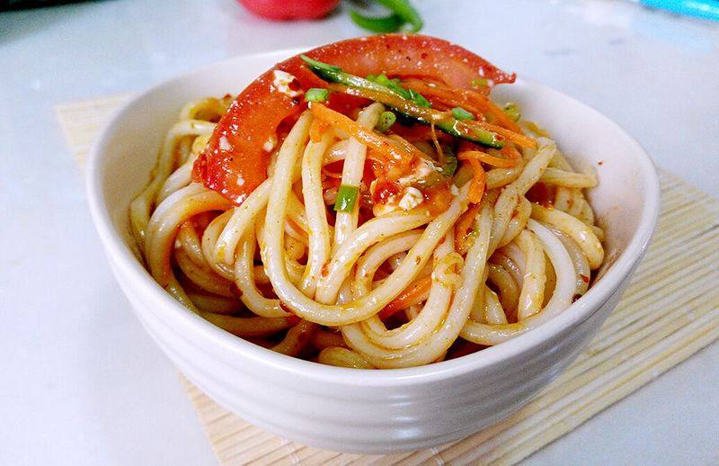12:将面条装入大碗中,把切好的黄瓜、胡萝卜、青辣椒、豆腐、西红柿和蒜泥放在面条上,再加适量辣椒粉(加辣椒粉我忘记拍照片了)。