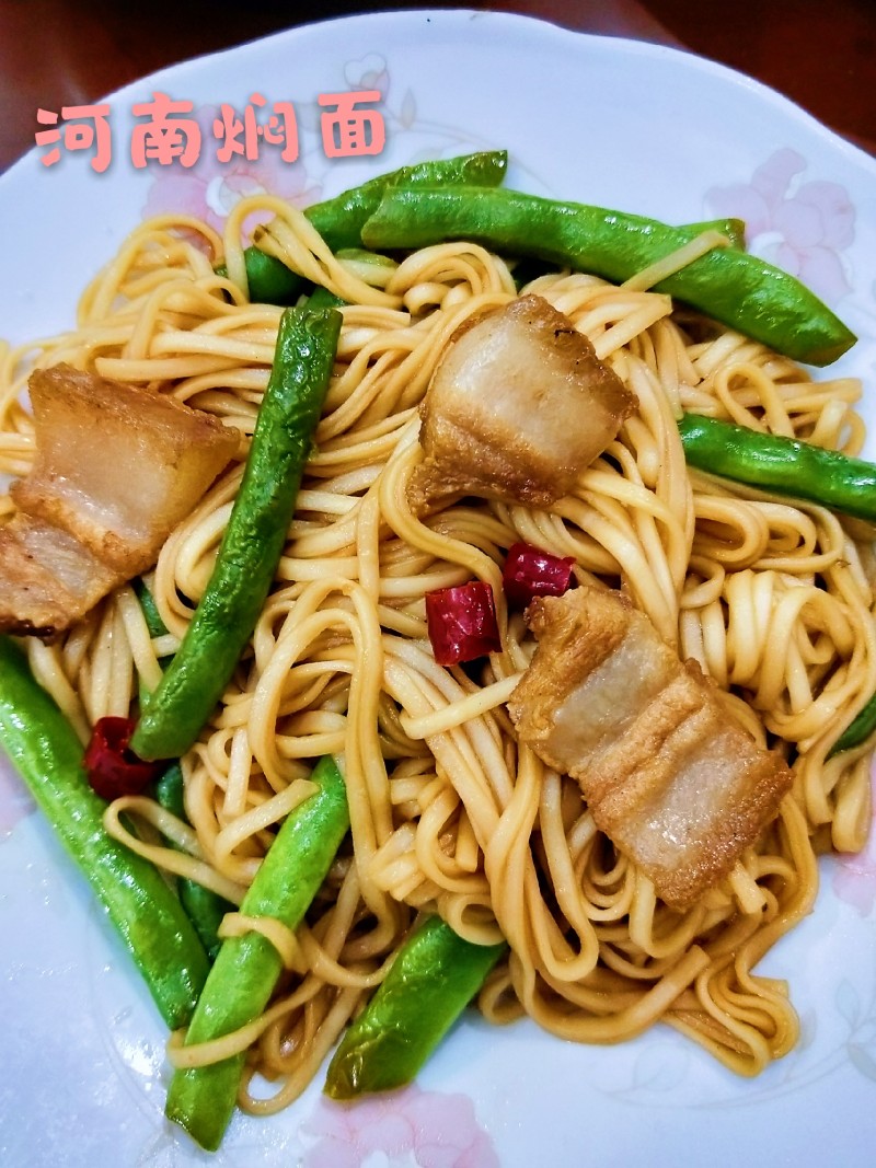 8:加入少许水,倒入面条放盐,酱油与鸡精,焖至水干。