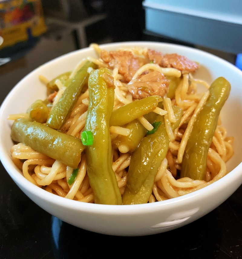 10:待汤汁快要收干时加入小葱花,将面条与四季豆混合,可以用筷子挑动,防止面条断掉。