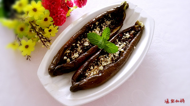 15:茄子经过第一次烤制出炉,将炒好的肉馅酿在茄子上,再次入烤箱160度5分钟出炉。