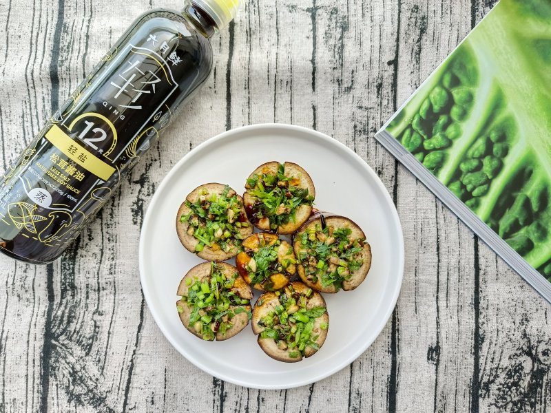 10:将蒸好的茄子淋上一勺六月鲜12克轻盐松茸酱油。