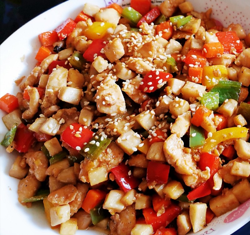 5:另起油锅炒鸡丁至熟透加入炒好的配菜。