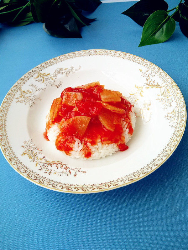 9:盘中加入米饭,浇上烧好的茄汁,美味鲜香的盖浇饭就可以吃了。
