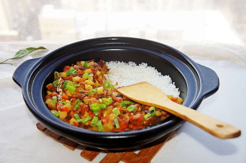11:将炒好的菜倒入锅中,盖上锅盖继续小火焖2分钟,然后关火,砂锅降温很慢,关火后依然会保持原温度一段时间,继续焖3分钟,这样焖出来的米饭特别香,锅底还有一层锅巴更好吃,然后撒点葱花就可以开餐了。