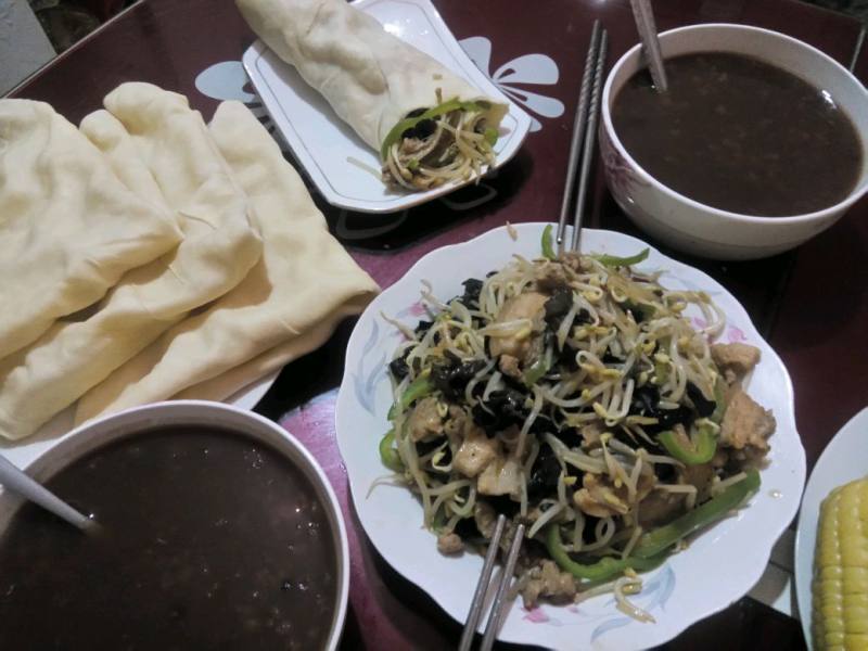 15:做了水熘饼,可以卷着吃,薏米红豆粥,简单的晚餐完成